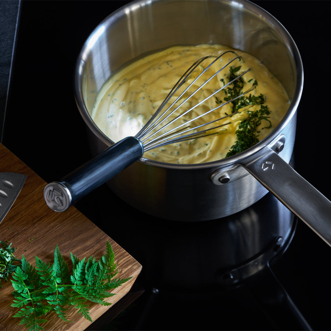 We asked Denmark’s top chefs what the ultimate series of pots and pans should look like, and here it is. Featuring professional details such as a pouring rim and materials used in the world’s finest restaurants. The set includes a 7L pot, a 4L pot, and a 2.5L saucepan. With these three functional sizes, you’ll be well-equipped, whether you’re making stock, preparing a stew, or whisking a Béarnaise sauce.