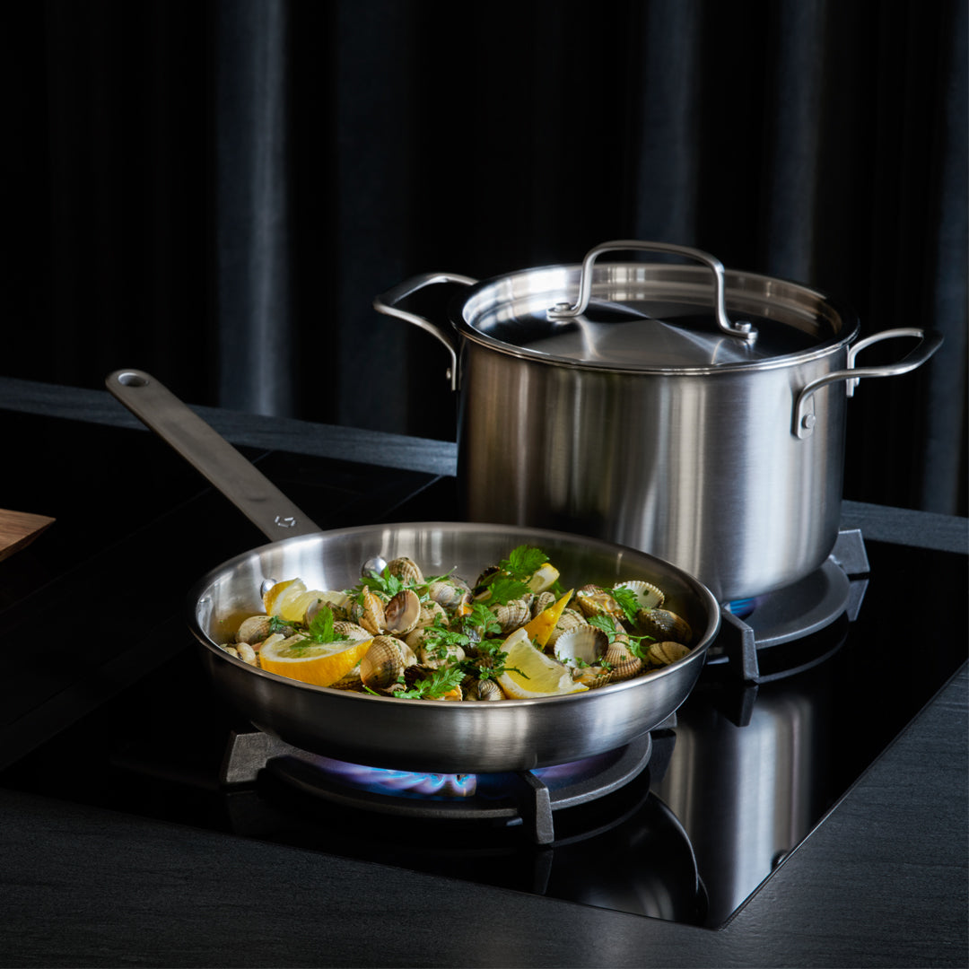 You get efficient heat control thanks to the aluminium core, which has sublime heat conduction and allows you to quickly raise or lower the temperature. Unlike cookware with an attached sandwich base, you'll find that the heat naturally spreads up along the edge because both the base and edges are 5-ply - ideal for things like risotto and simmering.