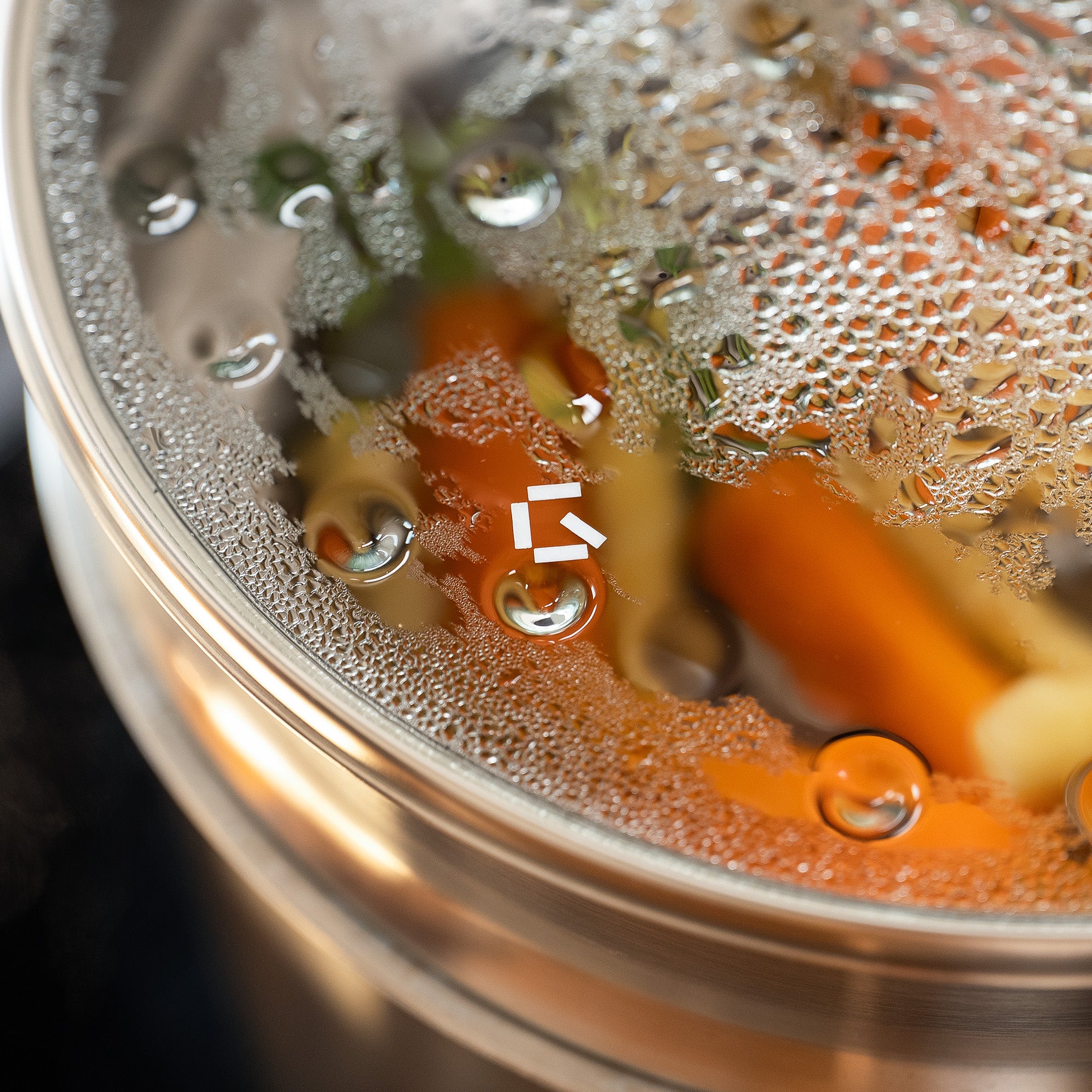 For 5-ply pans and pots: Full view when vegetables are steaming, potatoes are boiling and goulash is simmering.