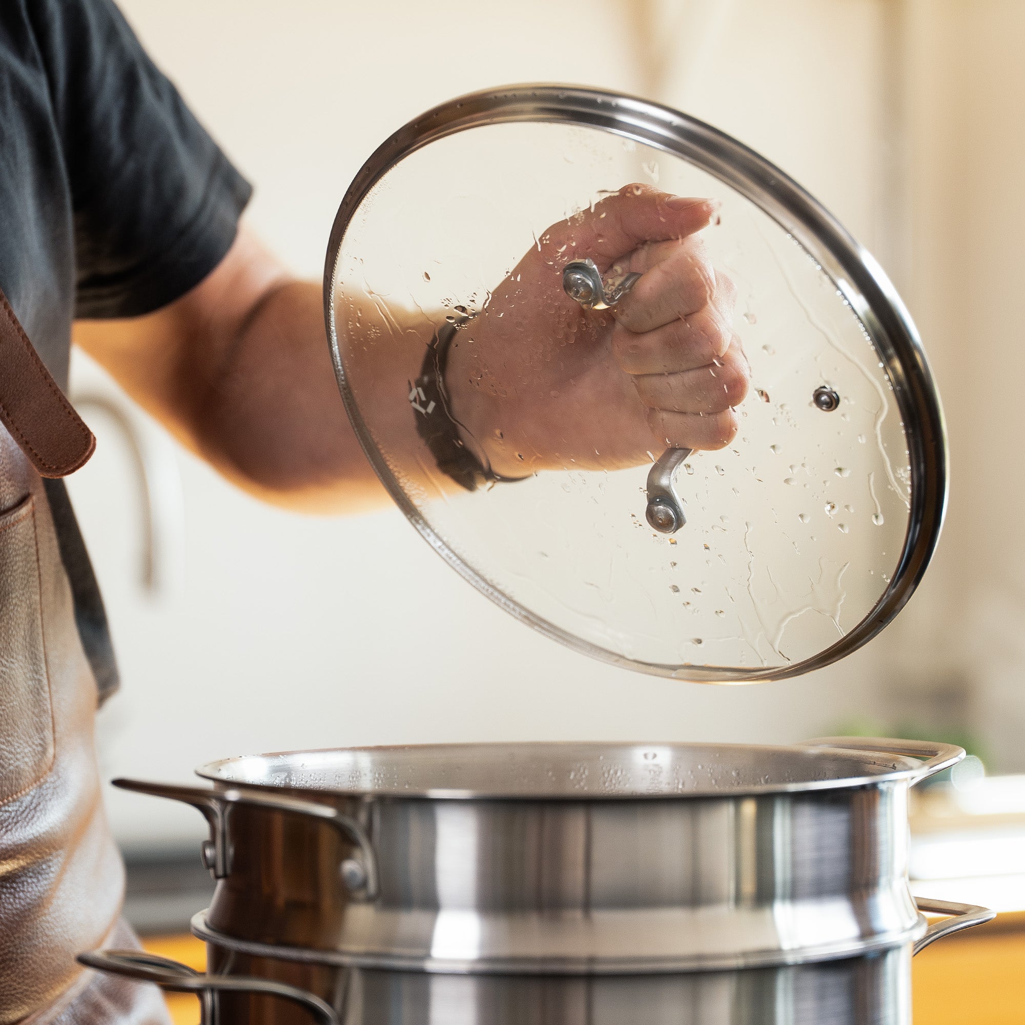 Now you can finally get a lid for your frying pan and the perfect upgrade for your 5-ply pot. The glass gives you a full view of the food, so it's easy to keep an eye on whether the rice is boiling or the stew is simmering – without losing heat by lifting the lid. And when the frying pan needs to deliver fried eggs, grilled sandwiches or braised pointed cabbage, the lid is an indispensable tool for the best possible result.