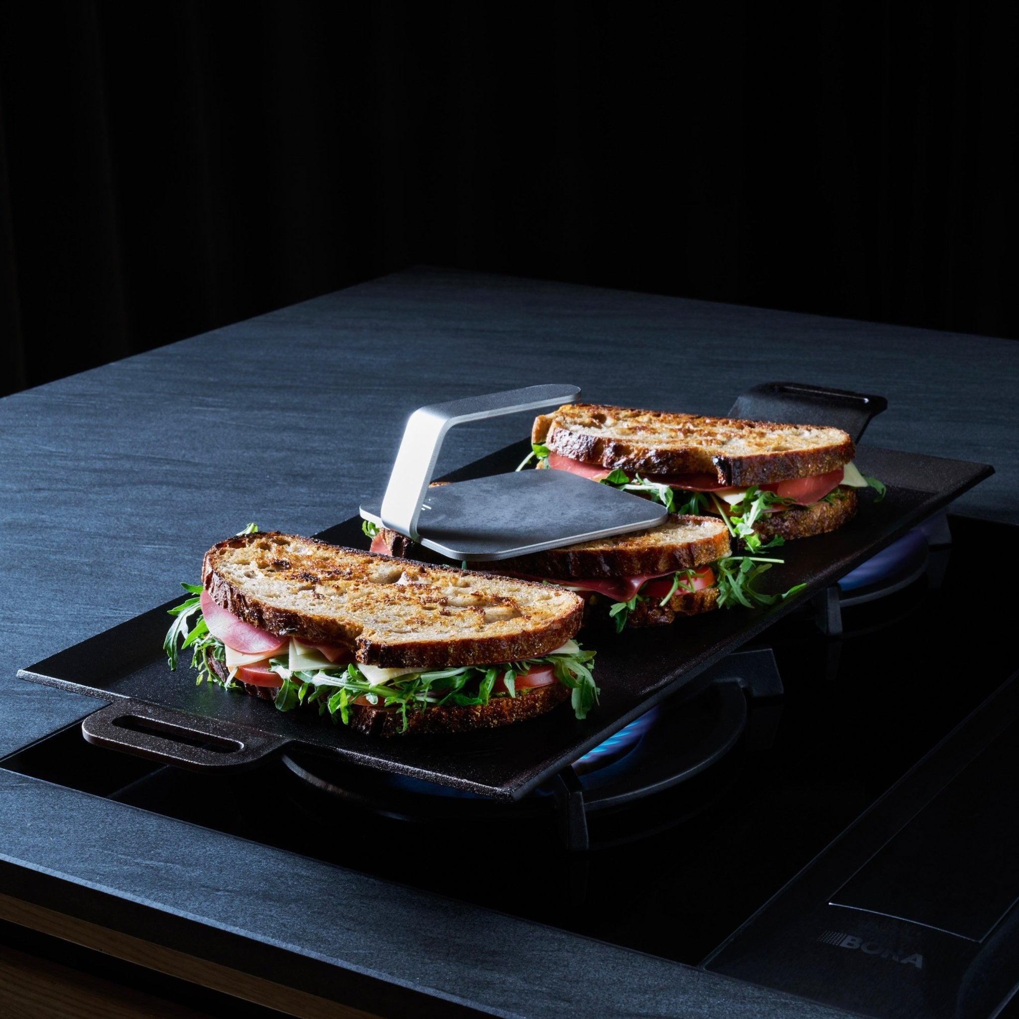 This set includes our carbon steel griddle and a stainless steel smasher. The griddle is designed to provide a crispier result and better caramelization of the surface of meats and vegetables. This means you'll achieve a deeper and more intense flavor in everything from steaks to grilled asparagus. The raised handles offer increased comfort when lifting the griddle and smasher from the induction stove to the grill, campfire, or directly to the table for serving.