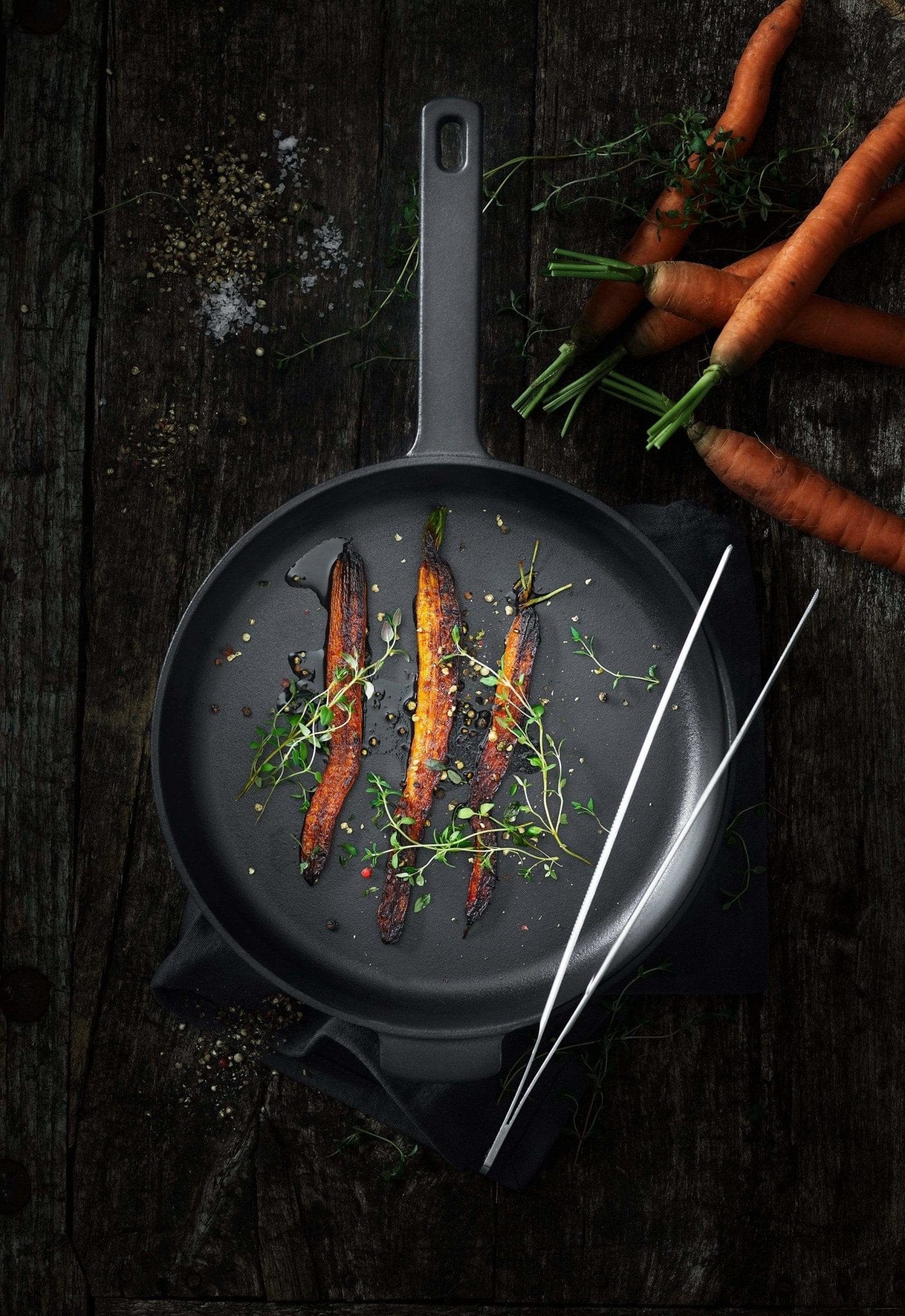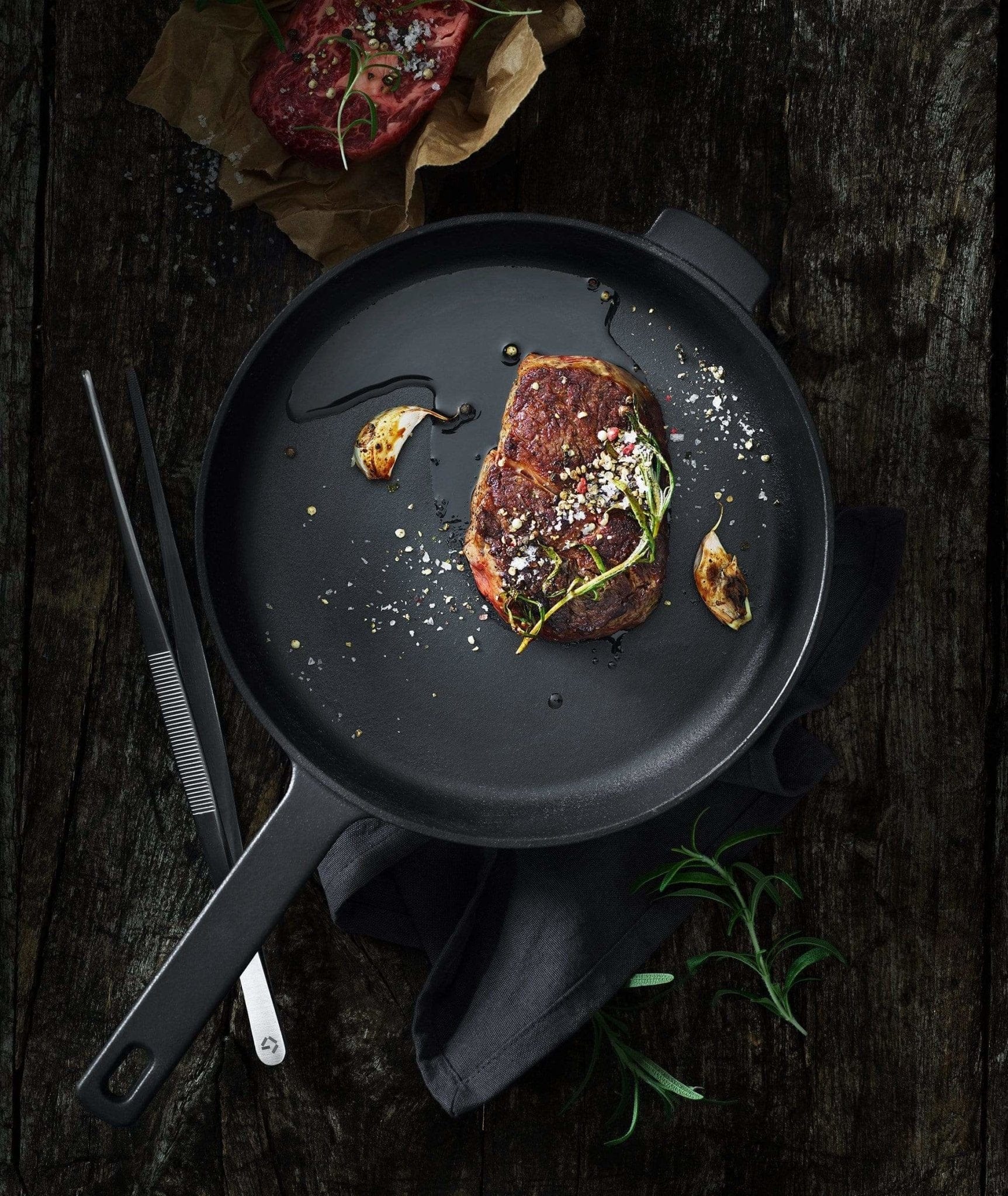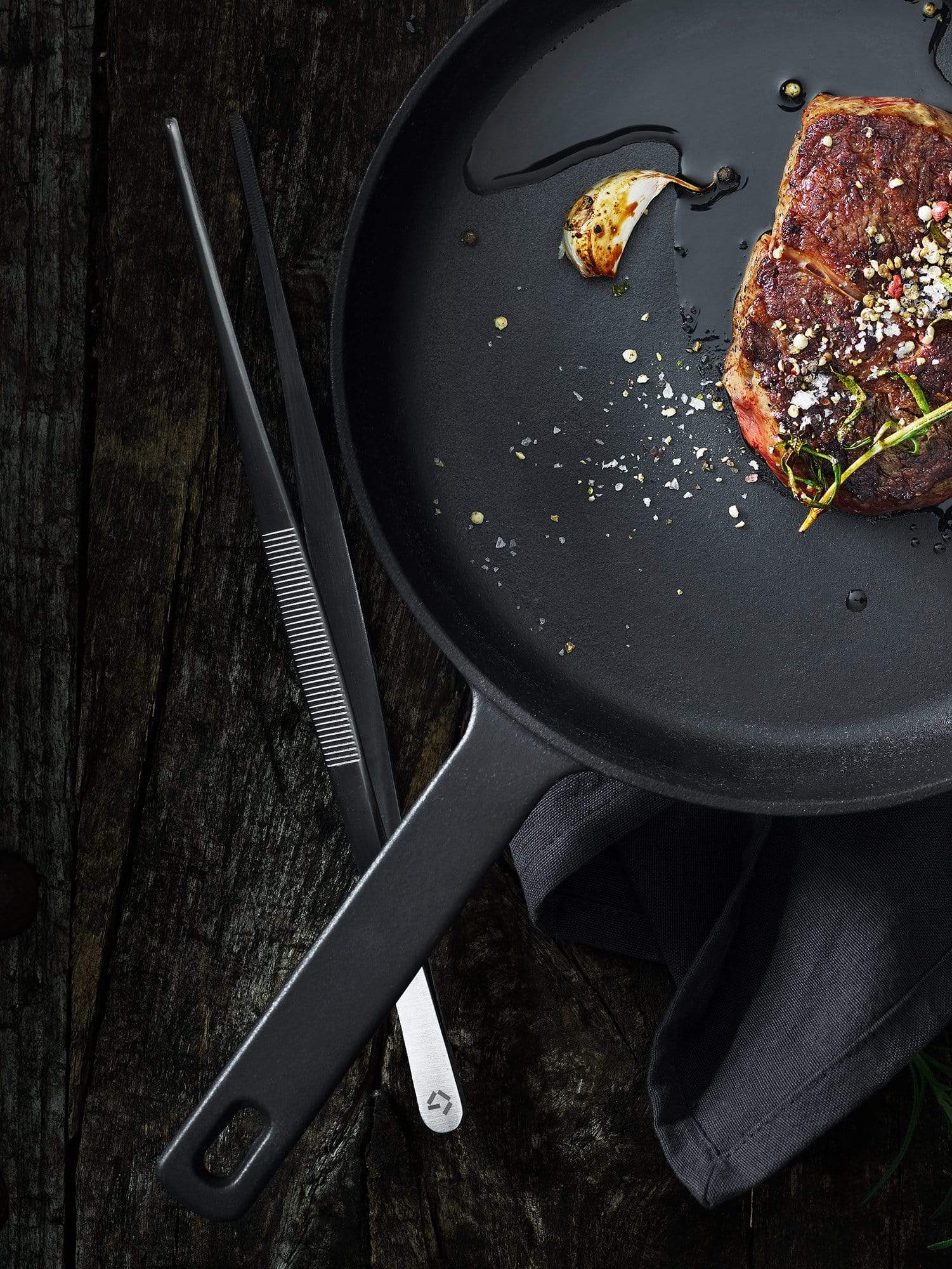 Sturdy and straight food tweezers in matte polished stainless steel. Indispensable when cooking at the stove or grill. Use the tweezers to flip meat and vegetables, and forget about bulky tongs.