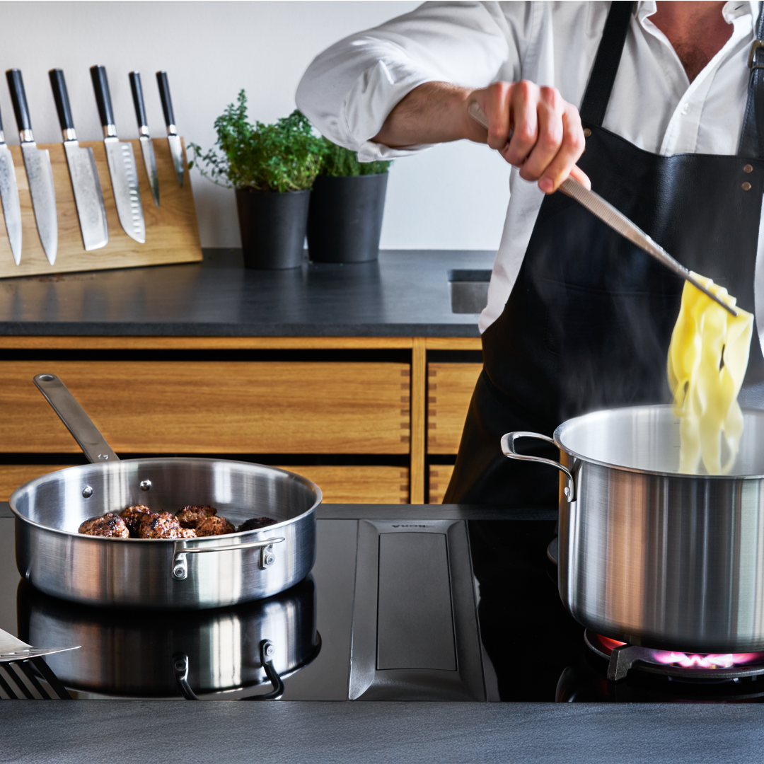 We asked Denmark's best chefs what the ultimate range of pots and pans should look like, and here it is. Featuring professional details such as a pouring rim, CoolGrip handle, and materials used in the world's finest restaurants. With its generous size and high sides, the sauté pan is indispensable in any kitchen – perfect for making pasta dishes, frying, and crafting delicious pan sauces.