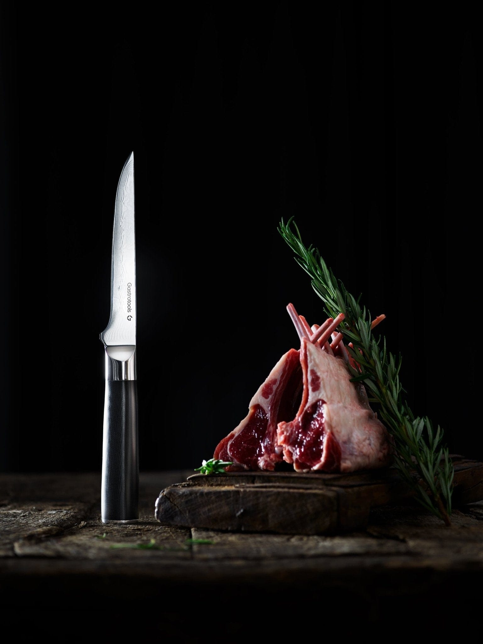 The boning knife, with its 67 layers of steel, provides unique precision and sharpness. The core of the knife is made of VG10 steel, and the overall combination of steels creates a wavy look and a hardness of 60 HRC on the Rockwell scale, whereas other types of kitchen knives typically have a hardness of 55 HRC. This hardness means that it stays sharp for a long time, giving you a tool for life.
